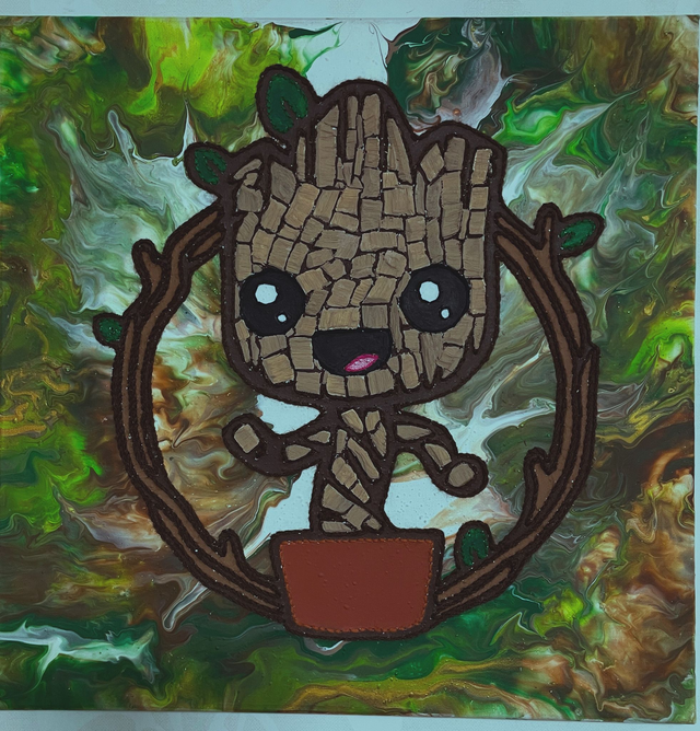Toile brodée Groot (Les Gardiens de la Galaxie), fond fluid art, broderie et copeaux de bois
